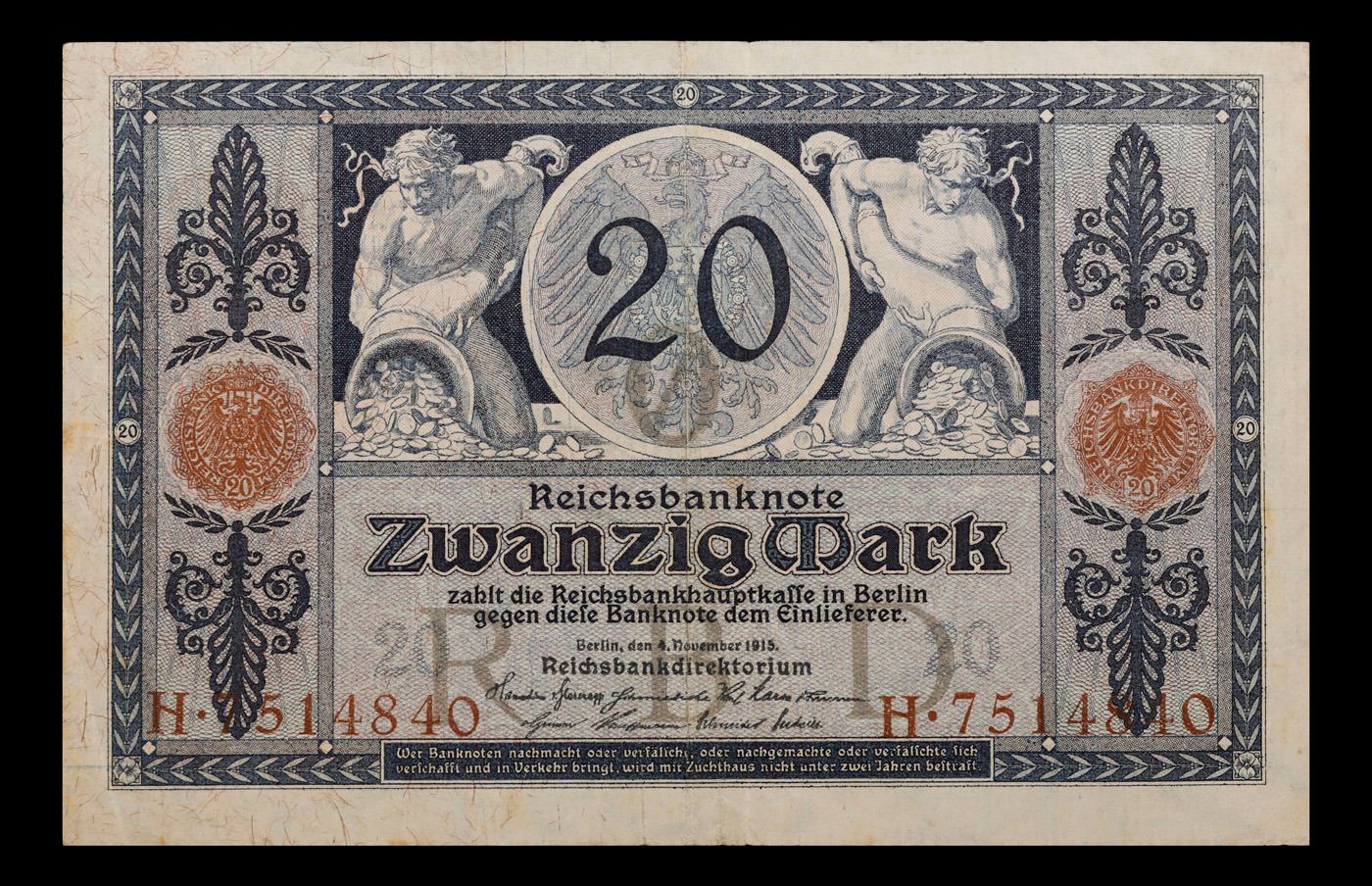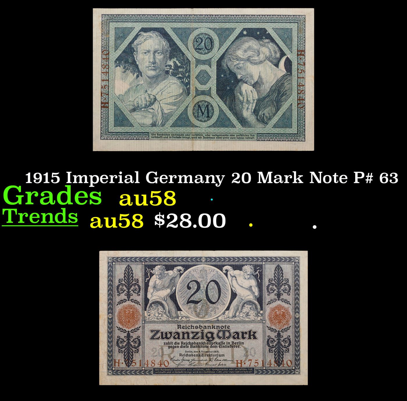 1915 Imperial Germany 20 Mark Note P# 63 Grades Choice AU/BU Slider.
