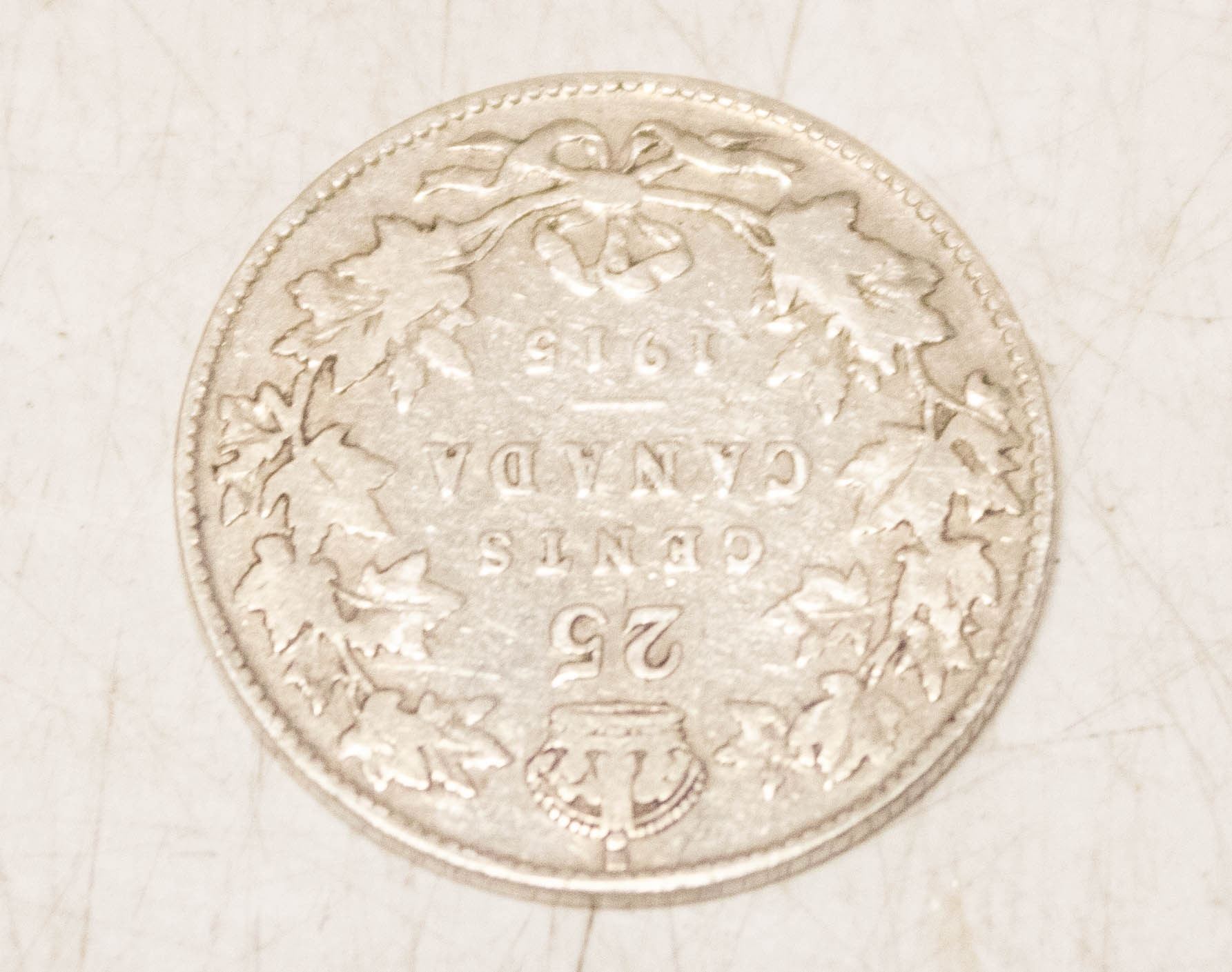 1915 OLD SILVER CANADA 25 CENTS COIN, CIRCULATED