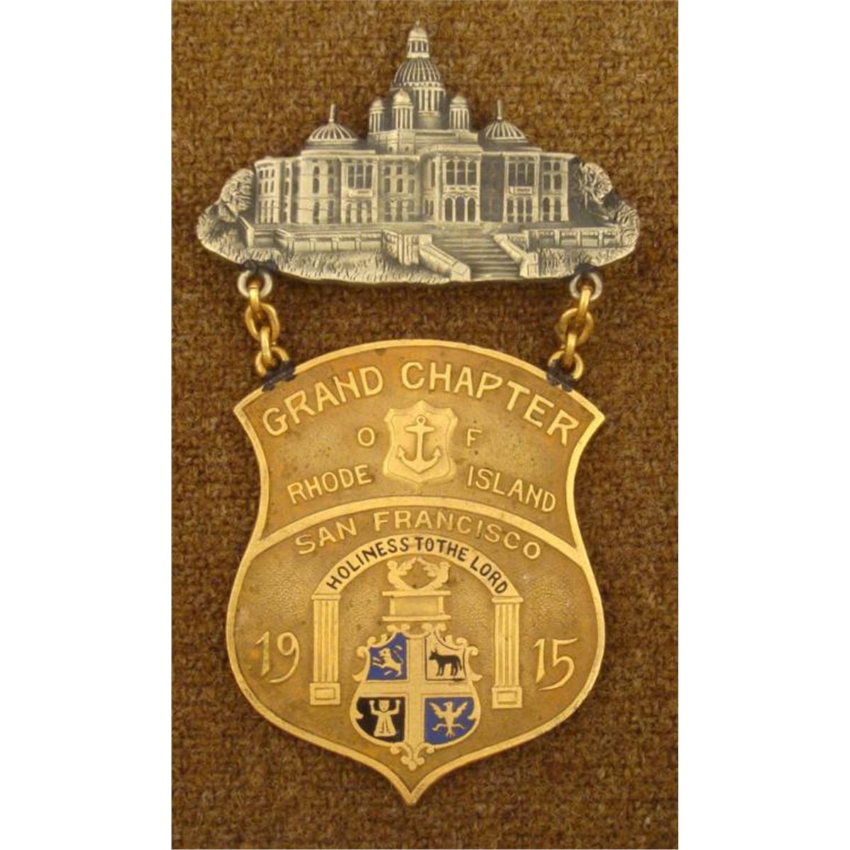 THIS IS A 1915 ORIGINAL MASONIC GRAND CHAPTER OF RHODE ISLAND, TWO PIECE BADGE. THE BADGE HAS THE RHODE ISLAND CAPITAL BUILDING ON TOP AND THE LOWER PART IS SUSPENDED BY A BRASS CHAIN & ENAMEL. THE BADGE MEASURES OUT TO BE 3 1/4" LONG. ON THE REVERSE IS THE MAKER'S MARK: "IRON & RUSSELL CO MAKERS-PROVIDENCE RI USA". THE BADGE IS A PIN BACK THAT IS IN EXCELLENT CONDITION BADGE-SFO MEET. *