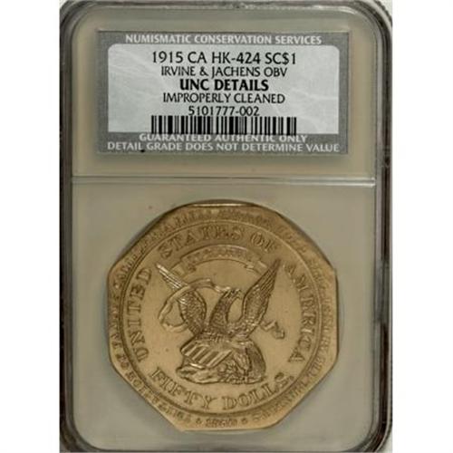 <B>1915 Octagonal Dollar, HK-424--Improperly Cleaned--NCS. Unc Details.</B></I> Gilt bronze, 40.4 x 40.4 mm. A scarcer variety of HK-424, with IRVINE & JACHENS, S.F. on the lower obverse (date side). This specific variety was apparently unknown to Hibler and Kappen when they published their work on so-called dollars in 1963, as it is unlisted. It is, however, considered by modern-day specialists to be part of HK-424. Perhaps the forthcoming revision to the so-called dollar reference will list this variety with a new subnumber. The design of this piece is styled after the awe-inspiring Humbert octagonal fifty dollar slugs of the 1850s. To add to the charm of this example, the V in IRVINE is actually an inverted A! Lightly cleaned surfaces keep this piece from being certified as problem-free, although the hairlines are minor and this would be a welcome addition to most collections. <BR><BR><b>Shipping:</b> Coins & Currency (<a target="_blank" href="http://www.heritageauctions.com/common/shipping.php">view shipping information</a>)