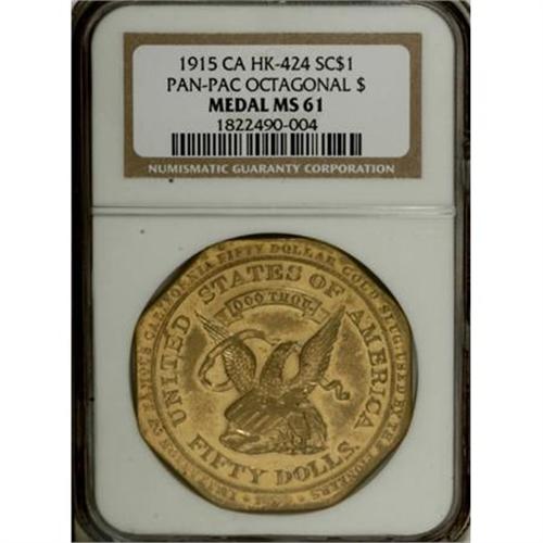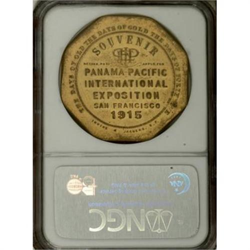 <B>1915 Octagonal Panama-Pacific Slug Irvine & Jachens Obverse MS61 NGC.</B></I> HK-424. Gilt bronze, 40.4 mm. The more elusive of the firm names for this particular issue, with the subvariety unlisted in Hibler-Kappen. Well struck overall, though a degree of softness is present on the eagle and its shield. The only example of the HK-424 Irvine & Jachens obverse certified by NGC.<BR><I>From The Jankovsky Collection of California Slug Facsimiles.</B></I><BR><BR><b>Shipping:</b> Coins & Currency (<a target="_blank" href="http://www.heritageauctions.com/common/shipping.php">view shipping information</a>)