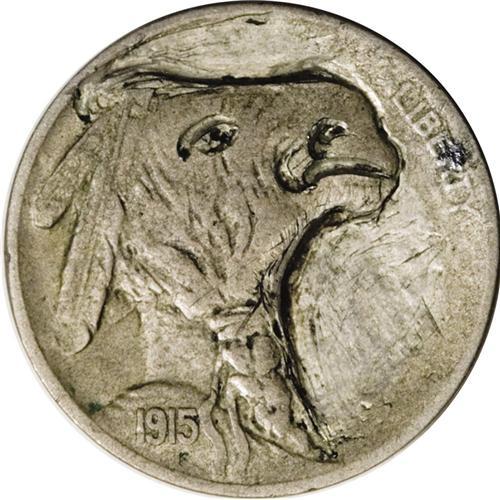 <B>1915-P:</B></I> Although the subject of this carving looks like a modern artist's rendering, the cataloger feels that this is an original piece by an unknown carver. Your guess is as good as mine as to what the image is on the obverse of this Extra Fine host coin (it appears to be a horse's head with the original Indian's feathers at the back and the pigtail below). Sharp, deep cuts have formed the eye, nose and mouth of this "thing," and the field over and under the subject has been roughly dressed. The grade is Below Average.<BR><BR><b>Shipping:</b> Coin/Currency (<a target="_blank" href="http://www.heritageauctions.com/common/shipping.php">view shipping information</a>)