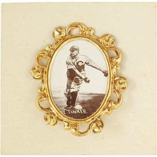<B>1915 PM1 Ornate Frame Pins Joe Tinker.</B></I> One-third of the greatest double play combination in baseball history, Tinker lets one fly here in the uniform of the 1907 Chicago Cubs, a rather unusual photographic choice for a fellow representing the Federal League Chicago Whales at the time of issue.<BR><BR> One of the most exciting "finds" of 2007 will present bidders in the Heritage Auction Galleries May 2008 Signature Sports Auction with the opportunity to own what are unquestionably the finest PM1 pins on the face of the earth. The nine pins were located by Heritage's consignors at an Arkansas flea market and purchased for a song, the seller unaware of the tremendous scarcity and importance of the treasures.<BR><BR> The discovery of these pins sheds a small beam of light upon an issue that still remains largely shrouded in mystery. Though it has been established that these Ornate-frame Pins date to 1915, the identity of the original issuer and the mode of distribution remain an enigma. This stunning assortment Mint pins adds a Hall of Famer to the known roster of PM1's, providing the hobby with its first look at a Chief Bender model. And the balance of the find, featuring Frank Baker, Frank Chance, Al Demaree, Ty Cobb, Johnny Evers (name only), Walter Johnson, Benny Kauff and Joe Tinker, each remain attached to its original 2x2" blank card, also never before encountered in the hobby.<BR><BR> Those few hobbyists who have met with this rare issue are well aware that condition problems are accepted as an inevitability when collecting PM1's, with oxidation and damage to the delicate metal frame and scratching of the central image present on essentially all existing specimens. The Mint condition of this Arkansas find is quite literally unprecedented, and should pique the interest of many elite collectors who demand nothing but the very best.<BR><BR><b>Shipping:</b> Miscellaneous Collectibles, Smal (<a target="_blank" href="http://www.heritageauctions.com/common/shipping.php">view shipping information</a>)