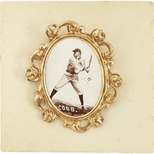 <B>1915 PM1 Ornate Frame Pins Ty Cobb.</B></I> The greatest name of the Dead Ball era demonstrates the wide stance and grip that gave birth to over 4,000 hits. The most extensively represented baseball figure from the tobacco days, Cobb is found in Mint condition in only a small handful of the thousands of surviving cards and pins of the era. Certainly this competes for the finest playing-days issue of all.<BR><BR> One of the most exciting "finds" of 2007 will present bidders in the Heritage Auction Galleries May 2008 Signature Sports Auction with the opportunity to own what are unquestionably the finest PM1 pins on the face of the earth. The nine pins were located by Heritage's consignors at an Arkansas flea market and purchased for a song, the seller unaware of the tremendous scarcity and importance of the treasures.<BR><BR> The discovery of these pins sheds a small beam of light upon an issue that still remains largely shrouded in mystery. Though it has been established that these Ornate-frame Pins date to 1915, the identity of the original issuer and the mode of distribution remain an enigma. This stunning assortment Mint pins adds a Hall of Famer to the known roster of PM1's, providing the hobby with its first look at a Chief Bender model. And the balance of the find, featuring Frank Baker, Frank Chance, Al Demaree, Ty Cobb, Johnny Evers (name only), Walter Johnson, Benny Kauff and Joe Tinker, each remain attached to its original 2x2" blank card, also never before encountered in the hobby.<BR><BR> Those few hobbyists who have met with this rare issue are well aware that condition problems are accepted as an inevitability when collecting PM1's, with oxidation and damage to the delicate metal frame and scratching of the central image present on essentially all existing specimens. The Mint condition of this Arkansas find is quite literally unprecedented, and should pique the interest of many elite collectors who demand nothing but the very best.<BR><BR><b>Shipping:</b> Miscellaneous Collectibles, Smal (<a target="_blank" href="http://www.heritageauctions.com/common/shipping.php">view shipping information</a>)