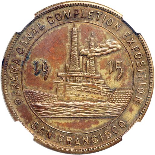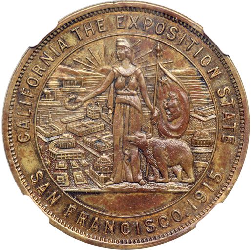 1915 Panama-Pacific Exposition, California - Expo State. SC$1. HK-414. NGC MS-62. NGC graded MS-62. Brass, 35mm. Brown/olive brass surfaces with areas of reddish oxidation.