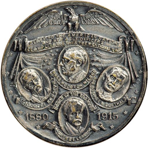 1915 Panama-Pacific Exposition, Four Portaits SC$1. HK-420. Mint State 63. Silver plated, antiqued, 34mm. Bust of Pres. Woodrow Wilson, Theodore Roosevelt, Col. George W. Goethals, and Count F. De Lesseps.