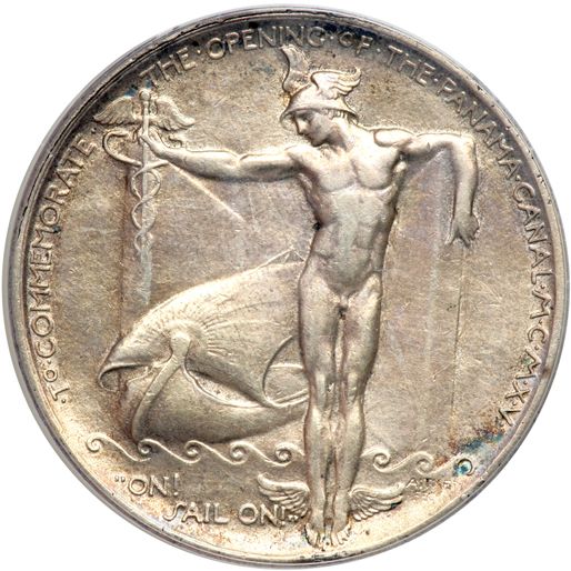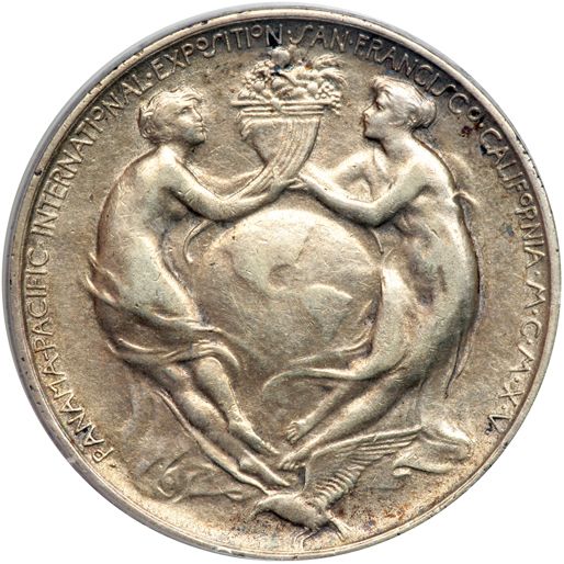 1915 Panama-Pacific Exposition, Official Medal. SC$1 HK-399. PCGS XF-40. PCGS graded EF-40. Silver. The Official Medal for the exposition. It was struck at the U.S. Mint Exhibit at the exposition. Obverse: Mercury opening Panama Canal locks as vessel, Argo, the symbol of navigation, passes. Signature of sculptor, Robert Aitken at lower right edge. Reverse: Two female figures representing two hemispheres Two females, representing the two hemispheres holding cornicopias. Conservatively graded.