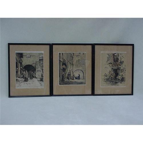 Set of three framed prints, 10 1/2'' x 13 1/4'', each depicting european street scenes, possibly of jewish people as seen by their dress. Two signed,Gorlice, one signed Tarnow. All dated 1915. Paper label on backe reads; from The James Foster house of art, Ann Arbor, Michigan.