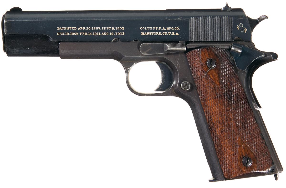 Produced in 1915, the fourth year of commercial production. Blade front and flat top "U" notch rear sights, with the two line, two block address and patent markings on the left side of the slide, Rampant Colt behind the serrations and "COLT AUTOMATIC/ CALIBRE 45" on the right side of the slide. "GOVERNMENT MODEL" over the serial number on the right side of the frame and "VP" and "R" on the left side of the trigger guard. Equipped with a wide checkered hammer, smooth long trigger, short beavertail grip safety, checkered slide catch, thumb safety and magazine release and smooth flat mainspring housing with a lanyard ring on the butt. Checkered grips with diamond patterns around the screw and unmarked two-tone magazine.