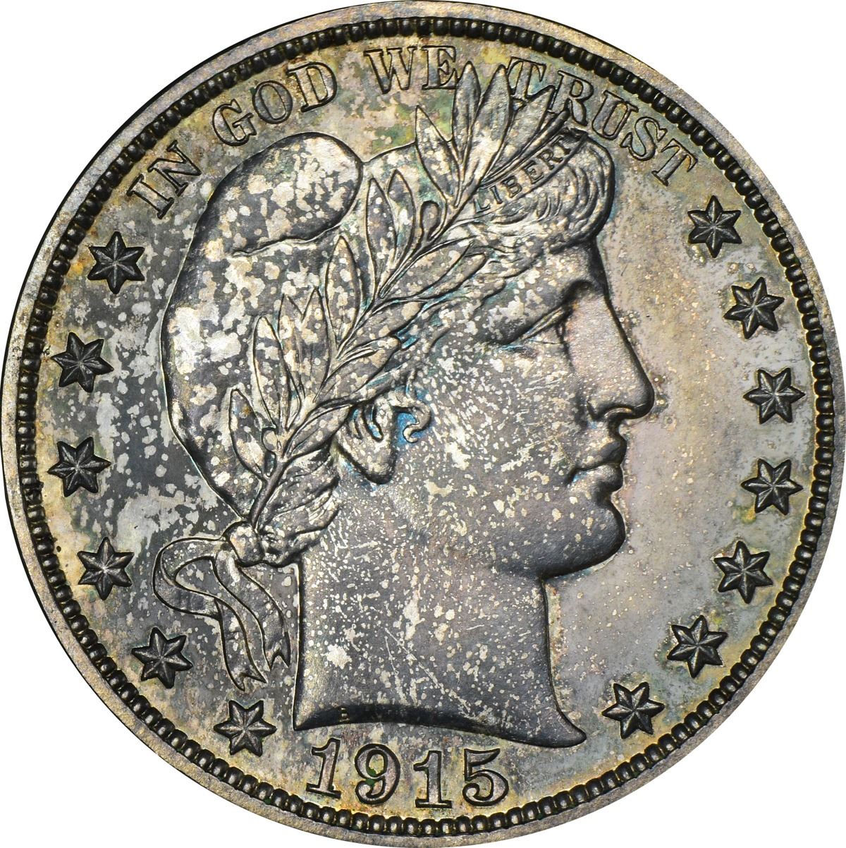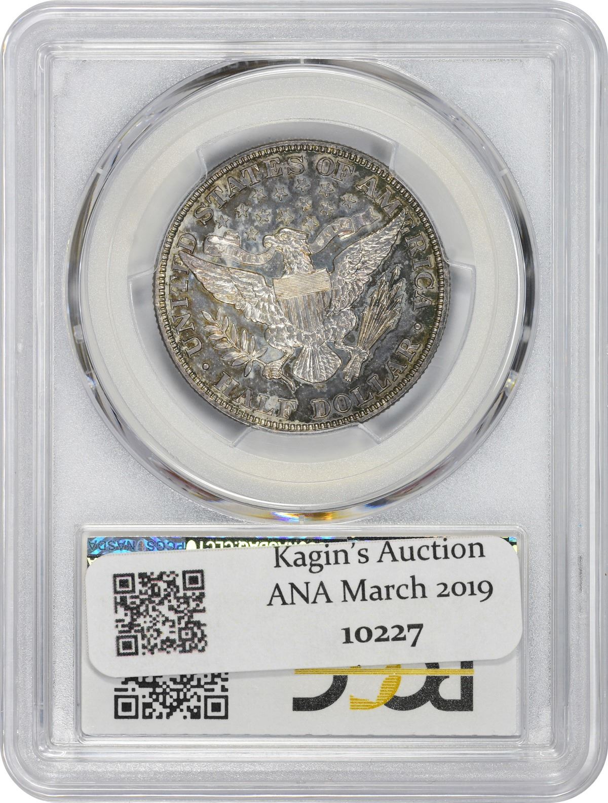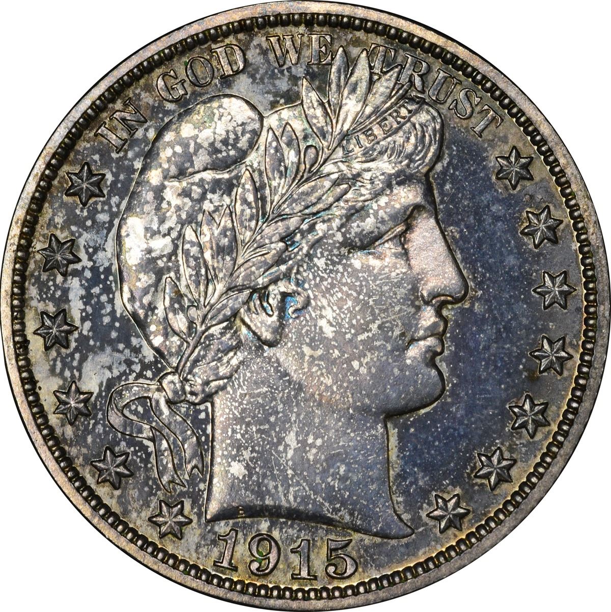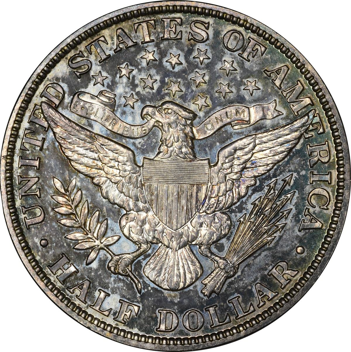 Dappled neon-blue and silver-gray toning engage both sides of this choice Proof from the final year of Barber half dollar coinage. One of just 450 Proofs of the date produced; only the 1914 Proof had a lower production run at 380 pieces. Both dates are key to the series in circulation format. PCGS #6562
