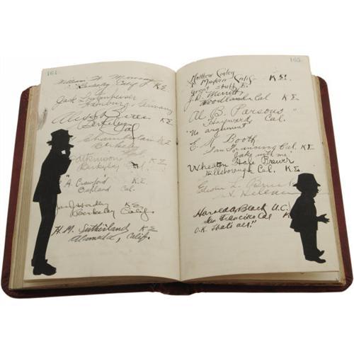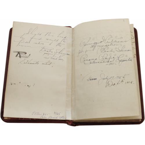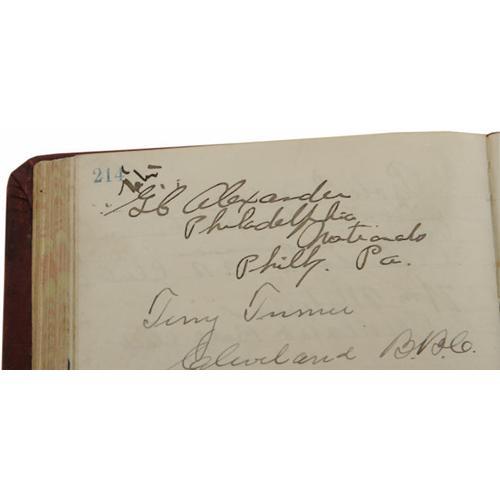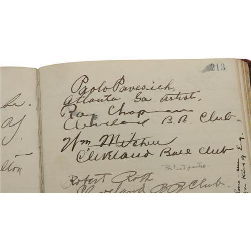<B>1915 Artist's Guestbook with Exceptionally Rare Autograph from Ray Chapman.</B></I> Those who participated in our October 2005 Signature auction will almost certainly recall the incredible cut paper silhouette of tragic baseball star Ray Chapman, which held one of the tiny handful of authentic Chapman autographs ever presented for public sale. Fortunately for us, and for our valued bidding clientele, one collector that spotted that listing was the owner of silhouette artist Beatrix Sherman's guestbook from her booth at the Pan Pacific International Exposition of 1915. Clearly this had to have been the venue for the creation of that magnificent piece offered by Heritage in October, as Chapman and several of his Cleveland Indians teammates have signed the guestbook that recorded the visitors to Sherman's booth. For those who might not be familiar with Chapman, he remains one of the toughest and most desirable autographs in the hobby due to his unfortunate distinction of having been the only man killed in Major League Baseball action, the victim of a Carl Mays fastball to the skull on August 16, 1920 in New York City. Chapman's autograph appears on page 213, tagged with the desirable inscription, "Cleveland B.B. Club." An errant hand barely brushed the doomed star's given name, but the autograph otherwise presents as a perfect 10/10. Joining him on his page and the next are fellow ballplayers, most notably a tough, very early signature from Hall of Famer G.C. Alexander, which he tags "Philadelphia Nationals, Philly, Pa." Alexander's autograph is likewise 10/10. Other members of the Indians signing are James Scott, Steve O'Neill, Ed Klepfer, ZZ Hagerman, William Mitchell, Robert Roth, Terry Turner, Thomas Daly, C.R. Garrett and more. Certainly on the 218 pages that comprise this fascinating volume there must be a hidden gem or five, but we'll note Sherman's opening inscription, Mary Pickford, silent film actor Arthur Ashley, aviator Art Smith, opera singer Nadia Gory and boxing legend Jack Dempsey. A few of Sherman's silhouettes are pasted on the pages inside as well, truly charming and skilled work. The leather bound volume remains in wonderful condition, with mild wear to the exterior but no damage whatsoever to the interior pages. The hundreds of autographs all remain in exactly the same condition as when they were penned nine decades ago. <I>LOA from PSA/DNA.</B></I> <BR><BR><B>Important notice:</B> Heritage usually auctions material at the rate of 200-250 lots per hour. On some occasions eBay Live bid software or the Internet may not be able to keep up with the pace of the auction. We recommend placing a realistic absentee bid now as insurance to avoid disappointment. Occasionally the auctioneer may eliminate or reject an eBay Live bid, and the auctioneer may also reopen a lot after the close of the eBay live bidding (usually because we missed an audience bid), and may reject your bid even if it shows you as the winning bidder. By bidding via eBay Live, you agree that Heritage may award the lot to another bidder at its sole discretion under the circumstances described above or any other reasonable circumstances. Since eBay bids are not shown to us until we open the lot on the floor, we treat those bids just like floor bids. In most cases the floor responds before the eBay bid is presented to us, due to Internet lag time, so for consistency we have made it a policy that floor bids are always considered first over tie eBay live bids. Also please note that all Heritage lots purchased through eBay Live carry a 22.5% Buyer's Premium. Please make sure you read the Terms and Conditions before you bid. This lot is being auctioned in conjunction with a live floor auction by Heritage Galleries & Auctioneers. All final auction and invoice information will be supplied by Heritage Galleries & Auctioneers, and all other information should be considered preliminary. Lot:19051 <BR><BR><B>Winning Notification and Billing:</B> After the FINAL session in this auction is complete, Heritage will send e-mail and snail mail invoices. This process normally takes several days. All final auction and invoice information will be supplied by Heritage Galleries & Auctioneers, and all other information should be considered preliminary. <BR><BR>This auction will be conducted on a live auction floor and over the Internet through eBay Live. If you choose to place an absentee bid, please take a moment to <font color='#0000ff'><u><a href='http://pages.ebay.com/liveauctions/help/before/laabsentee.html'>learn how eBay Live absentee bidding works</a></u></font><font color='#000000'>