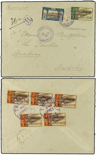 1915 Registered envelope to FRANCE bearing 1 c brown and red (5), 5 c green and brown and 25 c blue and brown (Yvert 38, 41, 44) tied by TRESOR ET POSTES AUX ARMEES CAMEROUN datestamp with boxed hand-struck registered in violet with TRESOR ET POSTES CENSOR on reverse. Superb item of occupation mail.