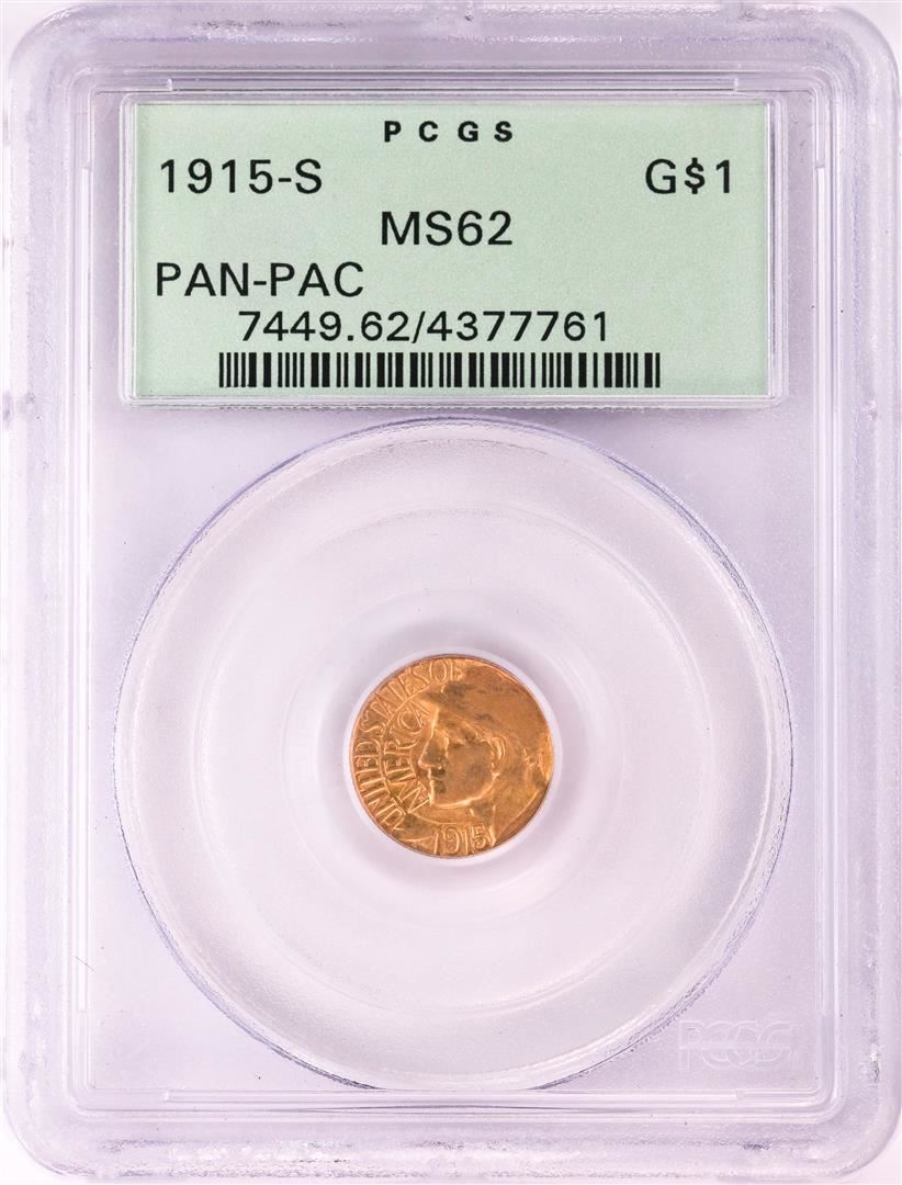 One 1915-S $1 Pan Pacific Commemorative Gold Coin PCGS MS62 Old Green Holder. PCGS Graded.
