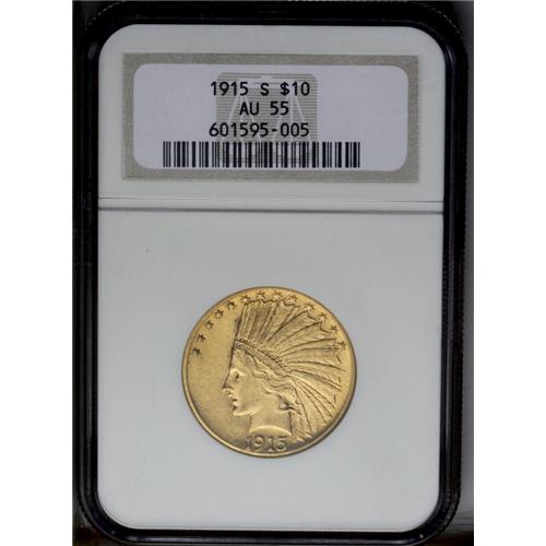 1915-S $10 AU55 NGC. A still-lustrous piece with light