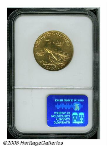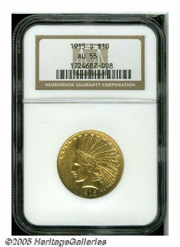 <B>1915-S<$10> AU55 NGC.</B></I> Bright and satiny, with moderate wear on the highpoints, for the grade, and numerous tiny abrasions on each side of the coin. From a mintage of only 59,000 pieces, with AU survivors being very scarce.