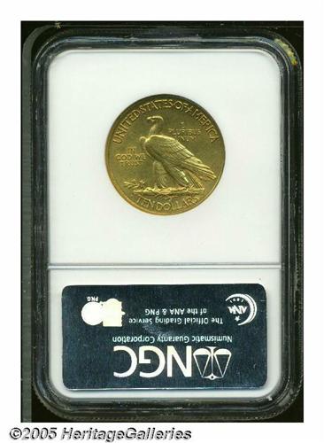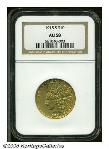 <B>1915-S<$10> AU58 NGC.</B></I> Boldly struck with bright luster and only the slightest degree of wear on the highpoints. The rich green-gold toning yields to glimmers of orange-golden iridescence near the borders. The matte-like surfaces seem blemish-free. Population: 93 in 58, 93 finer (6/05).
