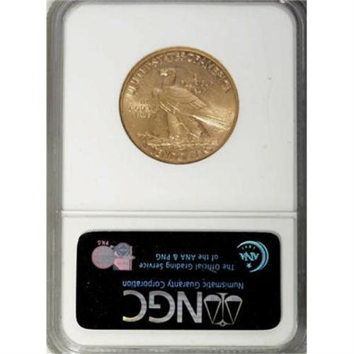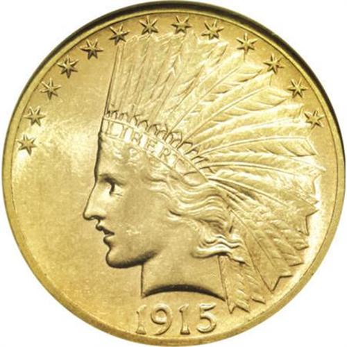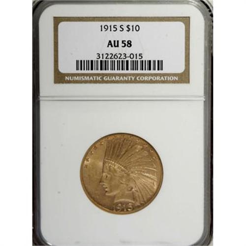 <B>1915-S $10 AU58 NGC.</B></I> A remarkable example with frosty orange-gold luster and wonderful aesthetic properties. Only a faint trace of wear keeps it from the full Mint State category. It clearly has the appearance of a Mint State piece upon first glance. Just 59,000 of these coins were minted in San Francisco, and few have survived to the present day. <BR><BR><B>Coin Engraver:</B> Augustus Saint-Gaudens<BR><BR><b>Shipping:</b> Coins & Currency (<a target="_blank" href="http://www.heritageauctions.com/common/shipping.php">view shipping information</a>)