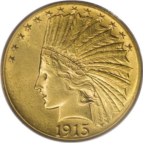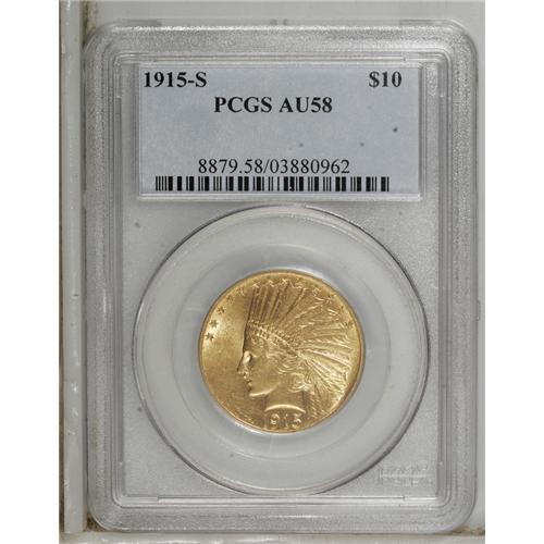 <B>1915-S $10 AU58 PCGS.</B></I> A lustrous and smooth near-Mint piece that has a hint of wear on the eagle's wing and leg. Marks are limited to faint contact on the cheekbone. A mere 59,000 pieces were struck, and most of the few hundred survivors are in circulated grades, since gold coins still circulated to some extent in the west in 1915.<BR><BR><b>Shipping:</b> Coins & Currency (<a target="_blank" href="http://www.heritageauctions.com/common/shipping.php">view shipping information</a>)