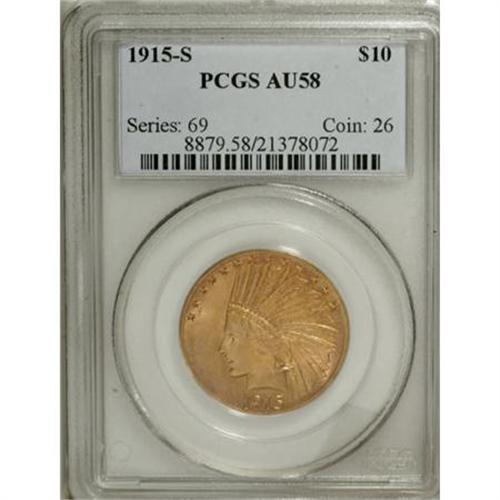 <B>1915-S $10 AU58 PCGS.</B></I> A pleasing example, this virtual Mint State piece has highly lustrous yellow-gold frost with hints of pink and lilac toning especially on the obverse. As one of the low-mintage issues in the series, with just 59,000 struck, this date is hard to locate in any or all grades.<BR><BR><B>Coin Engraver:</B> Augustus Saint-Gaudens<BR><BR><b>Shipping:</b> Coins & Currency (<a target="_blank" href="http://www.heritageauctions.com/common/shipping.php">view shipping information</a>\)