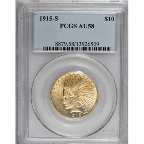 <B>1915-S $10 AU58 PCGS.</B></I> The shining surfaces of this pale straw-gold example show few marks overall, though a small dig appears to the right of the third star on the obverse. Minor but distinct friction is evident on the portrait and the highest edges of the eagle's wing and leg. One of only 59,000 pieces struck.<BR><BR><B>Coin Engraver:</B> Augustus Saint-Gaudens<BR><BR><b>Shipping:</b> Coins & Currency (<a target="_blank" href="http://www.heritageauctions.com/common/shipping.php">view shipping information</a>)