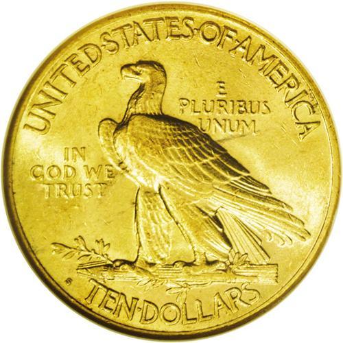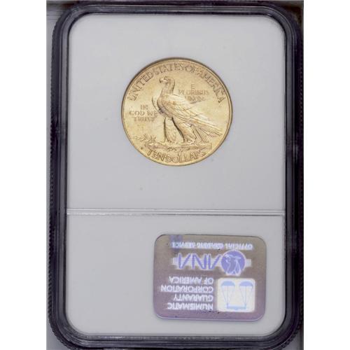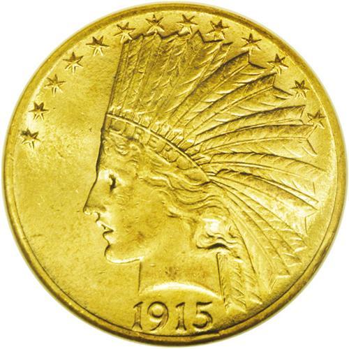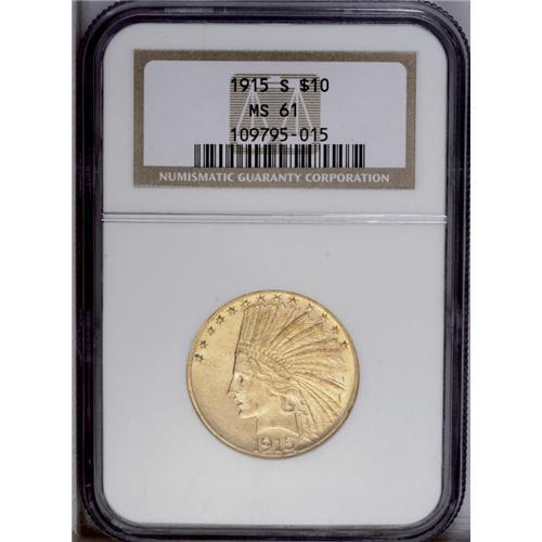 <B>1915-S<$10> MS61 NGC.</B></I> Both sides are sharply impressed over all but the highest points of the design. The richly colored, orange-gold surfaces are typically abraded for the BU grade designation. With the exception of the 1913-S, the 1915-S is the scarcest S-mint eagle produced between 1910 and 1915. Only 59,000 pieces were produced, and Uncirculated survivors are known for their high quality of luster.