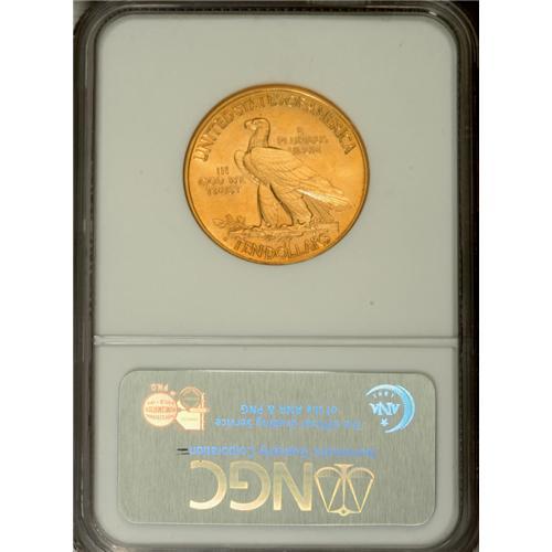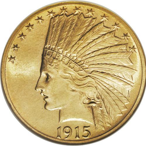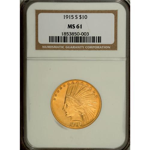 <B>1915-S $10 MS61 NGC.</B></I> Like other S-mint tens from this decade, the 1915-S is a condition rarity in Uncirculated grades. Only 59,000 pieces were produced, and apparently considerable effort was made to circulate these coins rather than have them set aside in bank vaults. This piece is fully struck on each side. The surfaces are bright with just a tinge of reddish patina.<BR><BR><b>Shipping:</b> Coin/Currency (<a target="_blank" href="http://www.heritageauctions.com/common/shipping.php">view shipping information</a>)