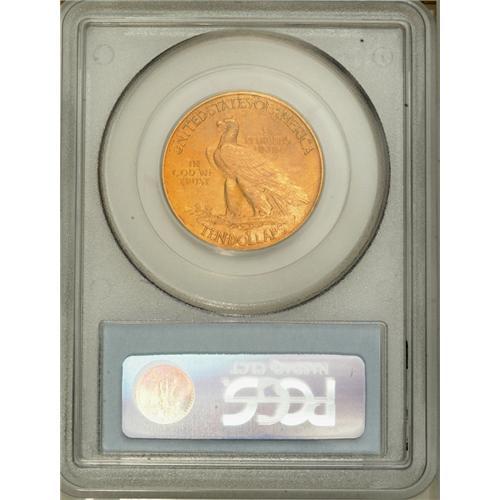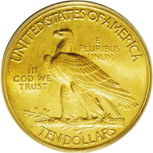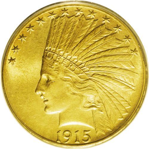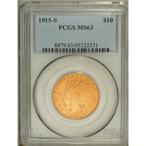 <B>1915-S<$10> MS63 PCGS.</B></I> The luster quality is simply breathtaking, both for the grade, and for an S-mint issue of this type. The surfaces are alive with swirling mint frost that further accents the powerfully impressed, sharply detailed features. Only a few noticeable bagmarks stand between this attractive Indian eagle and an even higher grade. In an absolute sense, the 1915-S is more rare than the 1910-S, 1911-S, 1912-S, 1913-S, and 1914-S. A mere 59,000 S-mint eagles were struck in 1915, with most Uncirculated survivors grading no finer than MS62. Population: 28 in 63, 25 finer (7/06).