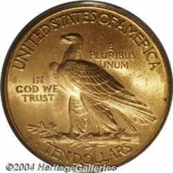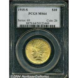 <B>1915-S<$10> MS64 PCGS.</B></I> This issue is one of the rarities in the series, and has the fourth lowest mintage of any No Periods issue. Just 59,000 were struck. Only the 1913-S, 1920-S, and 1930-S issues are rarer, among all San Francisco Mint issues. A wonderful example with soft yellow gold lustre. Very sharply struck and exceptionally attractive. Few survive in high-quality, with only five finer examples certified by PCGS. Population: 14 in 64, 5 finer (3/04). <BR><BR><B>Important notice:</B> Heritage usually auctions material at the rate of 200-250 lots per hour. On some occasions eBay Live bid software or the Internet may not be able to keep up with the pace of the auction. We recommend placing a realistic absentee bid now as insurance to avoid disappointment. Occasionally the auctioneer may eliminate or reject an eBay Live bid, and the auctioneer may also reopen a lot after the close of the eBay live bidding (usually because we missed an audience bid), and may reject your bid even if it shows you as the winning bidder. By bidding via eBay Live, you agree that Heritage may award the lot to another bidder at its sole discretion under the circumstances described above or any other reasonable circumstances. Since eBay bids are not shown to us until we open the lot on the floor, we treat those bids just like floor bids. In most cases the floor responds before the eBay bid is presented to us, due to Internet lag time, so for consistency we have made it a policy that floor bids are always considered first over tie eBay live bids. Also please note that all Heritage lots purchased through eBay Live carry a 20% Buyer's Premium. Please make sure you read the Terms and Conditions before you bid. </span></font></tr></table></td></tr></table>