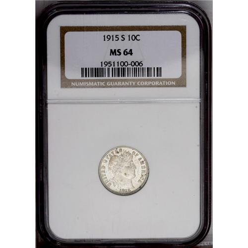 <B>1915-S<10C> MS64 NGC.</B></I> Speckles of gold-tan patina dot lustrous surfaces that display nicely struck devices. Minute marks on Liberty's cheek limit the grade. Census: 36 in 64, 20 finer (1/06).