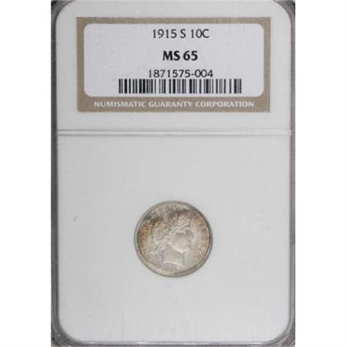 <B>1915-S 10C MS65 NGC.</B></I> Golden-brown and cobalt-blue toning make occasional visits to the lustrous surfaces of this well preserved Gem. Sharply struck throughout. Census: 13 in 65, 10 finer (12/07).<BR><BR><B>Coin Engraver:</B> Charles E. Barber<BR><BR><b>Shipping:</b> Coins & Currency (<a target="_blank" href="http://www.heritageauctions.com/common/shipping.php">view shipping information</a>)