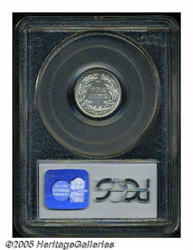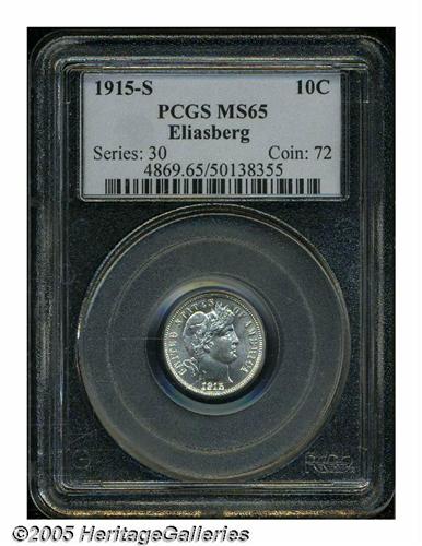 <B>1915-S<10C> MS65 PCGS.</B></I> Lustrous Gem example with a few tiny spots of yellow color on the otherwise stone-white surfaces. A tiny mark below the M in the denomination and a few minute light abrasions are noted for accuracy?