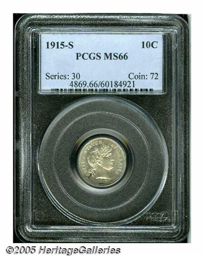 <B>1915-S<10C> MS66 PCGS.</B></I> Boldly struck and quite lustrous for this date, with just a few specks of toning below Liberty's ribbon with a few more flecks of gold on the reverse. Identifiable by a small planchet flake near the bottom right of the D of UNITED. Certainly in the top two dozen of those known, most of those are equal to this Gem. Population: 10 in 66, 1 finer (6/05).