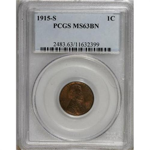 <B>1915-S 1C MS63 Brown PCGS.</B></I> PCGS Population (23/28). NGC Census: (25/46). Mintage: 4,833,000. Numismedia Wsl. Price for NGC/PCGS coin in MS63: $175. (#2483)<BR><BR><B>Coin Engraver:</B> Victor D. Brenner<BR><BR><b>Shipping:</b> Coins & Currency (<a target="_blank" href="http://www.heritageauctions.com/common/shipping.php">view shipping information</a>)
