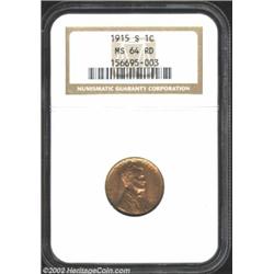 1915-S 1C MS64 Red NGC. An elusive, mintmarked date in the series, this specimen is very boldly struck with an even reddish color. Scattered dark spots limit the grade.From the Robert Tarr, Sr. Collection. Important notice: We expect to be auctioning lots at the rate of 200-250 per hour. Sometimes eBay Premier live bid software cannot keep up with that pace, so we strongly recommend that you place a realistic proxy bid now as insurance to avoid disappointment. Also please note that all Heritage/CAA lots purchased through eBay Premier carry a 20% Buyer's Premium. Please make sure you read the Terms and Conditions.