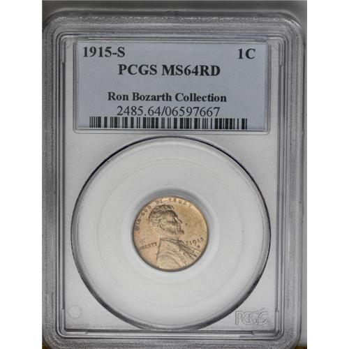 <B>1915-S<1C> MS64 Red PCGS.</B></I> Ex: Ron Bozarth Collection. Matte-textured surfaces are struck with razor sharp detail, particularly on Lincoln's hair and facial features and bow tie, and emit copper-gold luster on the obverse, while the reverse takes on gold and faded crimson hues. Bits of scattered carbon keep from full Gem status. Population: 45 in 64 Red, 33 finer (5/06).
