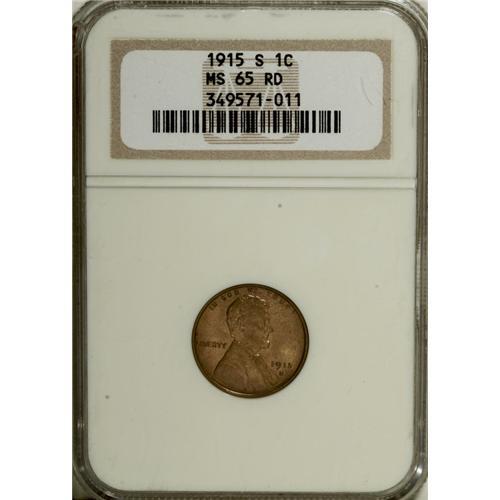 <B>1915-S 1C MS65 Red NGC.</B></I> This is a satiny-textured Gem example whose moderately bright features exhibit full mint luster. The striking details are well executed and the unspotted surfaces possess a slight "woodgrain" effect visible on close examination. Gem 1915-S Lincoln cents are legitimately scarce and represent an outstanding value within the series. Census: 10 in 65 Red, 1 finer (4/07).<BR><BR><b>Shipping:</b> Coins & Currency (<a target="_blank" href="http://www.heritageauctions.com/common/shipping.php">view shipping information</a>)