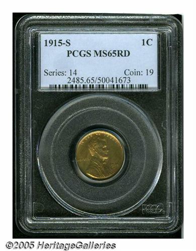 <B>1915-S<1C> MS65 Red PCGS.</B></I> A scarcity at all levels of Uncirculated and a true stopper among full red Lincoln Cents. This specimen is extremely well struck and displays fiery golden-red brilliance over both sides. A Gem quality, virtually unspotted example. Population: 28 in 65, 5 finer (6/05).<BR><I>From The William Bickel Collection, Part One.</B></I>