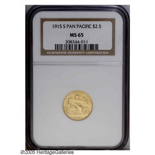 <B>1915-S<$2 1/2> Panama-Pacific Quarter Eagle MS65 NGC.</B></I> An superlative Gem specimen with brilliant lemon-yellow color. Satiny surfaces with extensive die polishing lines in the fields on both sides. At first glance, some of these actually look like bright scratches, but close examination will show that this coin has exceptionally preserved surfaces.<BR><I>From The Lexington Collection.</B></I>