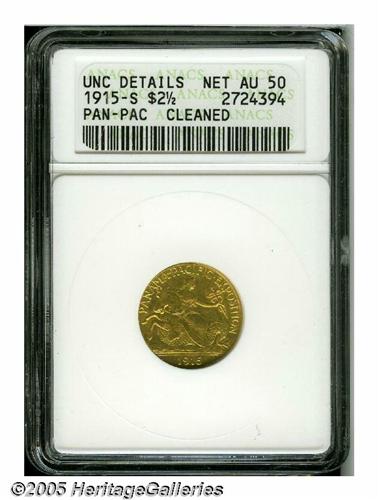 <B>1915-S<$2 1/2> Panama-Pacific Quarter Eagle--Cleaned--ANACS. Unc Details, Net AU50.</B></I> A seemingly old cleaning has since been overlaid in subtle reddish patina. Affordable, yet reasonably attractive quality.<BR><I>From the Dr. Kurt Peters Collection.</B></I> From the Dr. Kurt Peters Collection.