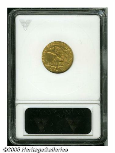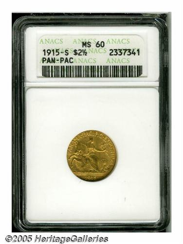 <B>1915-S<$2 1/2> Panama-Pacific Quarter Eagle MS60 ANACS.</B></I> Well struck with even orange-gold coloration, muted luster, and a couple of faint pinscratches on the obverse. A scarce, low mintage issue.
