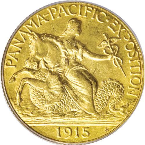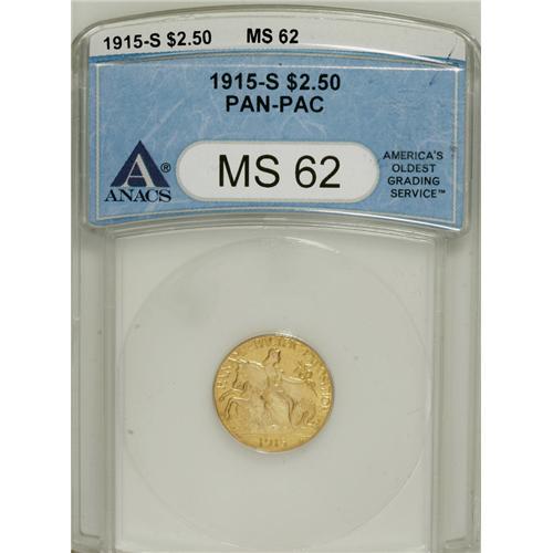 <B>1915-S $2 1/2 Panama-Pacific Quarter Eagle MS62 ANACS.</B></I> Of the two commemorative quarter eagle issues, the Panama-Pacific is much more elusive than the Sesquicentennial. The former, with a net mintage of just 6,749 pieces, is represented here by a pleasing survivor. The piece has subtly lustrous butter-yellow surfaces that exhibit few marks for the grade. The eagle's feathers and Columbia's head are softly struck, with the latter displaying only minimal detail.<BR><BR><b>Shipping:</b> Coins & Currency (<a target="_blank" href="http://www.heritageauctions.com/common/shipping.php">view shipping information</a>)