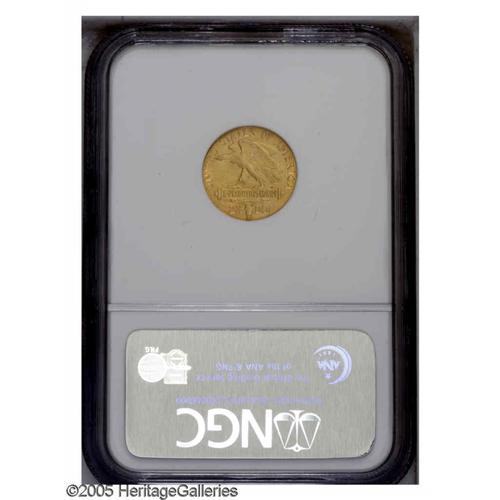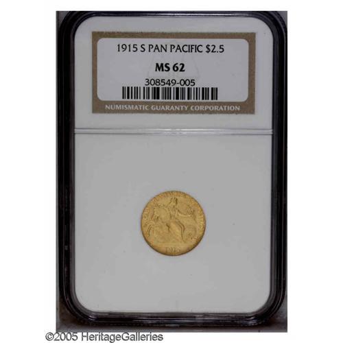 <B>1915-S<$2 1/2> Panama-Pacific Quarter Eagle MS62 NGC.</B></I> This honey-gold Commemorative Quarter Eagle has a pleasing appearance when viewed with the naked eye. Evaluation beneath a loupe reveals a pinscratch above the tail of the hippocampus, and another across its legs. A few ticks on the obverse rim and a couple of small lacquer drops on the reverse field are also noted.