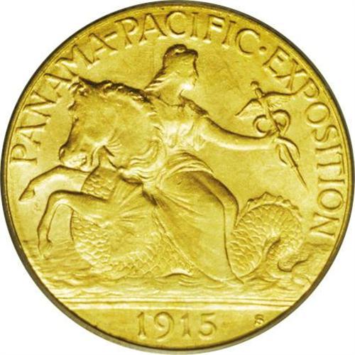 <B>1915-S<$2 1/2> Panama-Pacific Quarter Eagle MS63 PCGS.</B></I> This issue has always been one of the most avidly sought of all U.S. gold commems. One of only two commemorative issues to be struck in this denomination, it certainly has one of the most interesting designs in U.S. coinage. Vibrant peach-gold color with essentially problem-free, satiny surfaces.