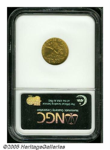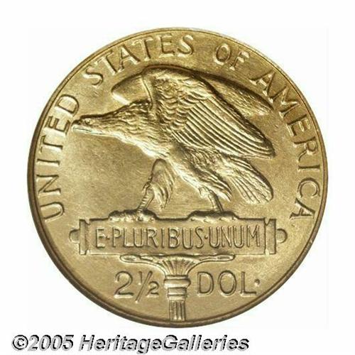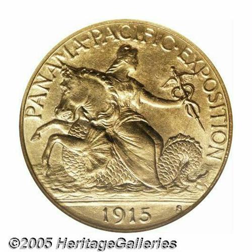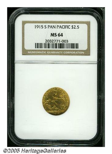 <B>1915-S<$2 1/2> Panama-Pacific Quarter Eagle MS64 NGC.</B></I> The Pan-Pac Quarter Eagle is one of the scarcer commemorative gold coins and it is also one of the best designed. The net mintage of this issue was only 6,749 pieces, with a substantial number melted as unsold. This is lightly abraded example that has satiny mint luster. A few minor marks on the obverse limit the grade.