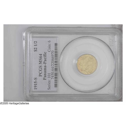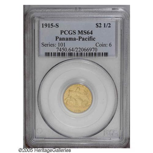 <B>1915-S<$2 1/2> Panama-Pacific Quarter Eagle MS64 PCGS.</B></I> Satiny and free of most marks, with lots of original mint luster on both sides. The Pan-Pac Quarter Eagle is the only gold commemorative of this denomination besides the $2.5 Sesquicentennial, and additional demand for this coin comes from collectors who specialize in the 1915 Panama-Pacific Exposition memorabilia.