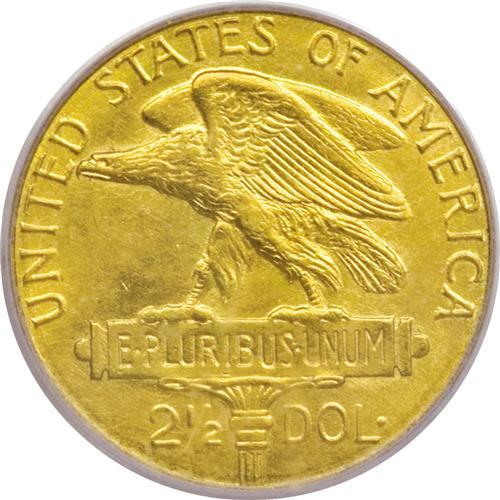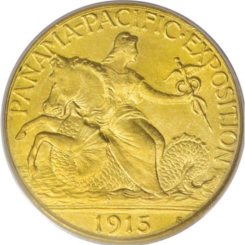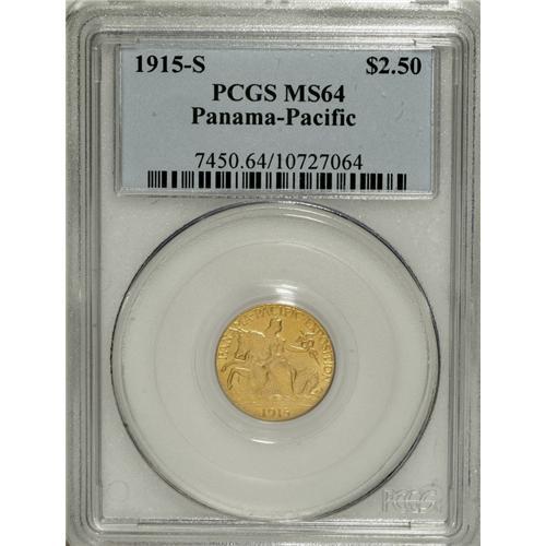 <B>1915-S $2 1/2 Panama-Pacific Quarter Eagle MS64 PCGS.</B></I> The Panama-Pacific quarter eagle was part of a series of commemorative silver and gold coins struck to celebrate the opening of the Panama Canal. This near-Gem example displays apricot-gold color tinted with hints of light green. The design elements are well brought up, and lustrous surfaces are devoid of significant marks.<BR><BR><b>Shipping:</b> Coins & Currency (<a target="_blank" href="http://www.heritageauctions.com/common/shipping.php">view shipping information</a>)