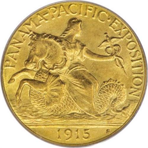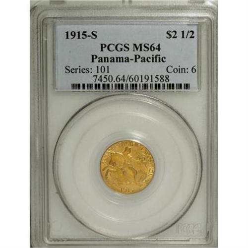 <B>1915-S $2 1/2 Panama-Pacific Quarter Eagle MS64 PCGS.</B></I> A lovely near-Gem example that is coated in delicate reddish patina and is just a couple of trivial luster grazes from an advancement in grade. These beautifully designed issues were issued in conjunction with the Panama-Pacific Exposition to celebrate the opening of the Panama Canal.<I><BR>From The Arnold & Harriet Collection.</B></I><BR><BR><b>Shipping:</b> Coins & Currency (<a target="_blank" href="http://www.heritageauctions.com/common/shipping.php">view shipping information</a>)