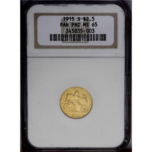 <B>1915-S<$2 1/2> Panama-Pacific Quarter Eagle MS65 NGC.</B></I> David Bowers (1991) writes that the 1915-S Panama-Pacific quarter eagle was the first of two 20th-century issues of this denomination to be produced in the commemorative series, the other coming more than a decade later in connection with the 1926 Sesquicentennial Exposition. The Gem offered in this lot displays soft luster and yellow-gold patina imbued with subtle traces of light green. A sharp strike characterizes the design elements. A few unobtrusive handling marks on each side are mentioned for accuracy, and are entirely within the parameters of the MS65 grade level.