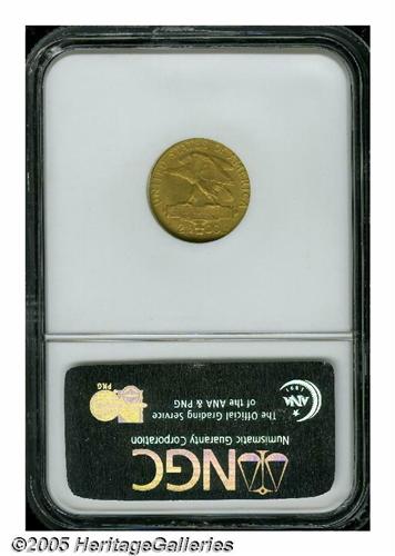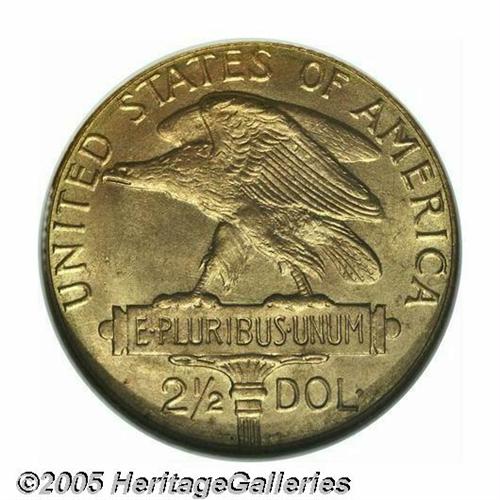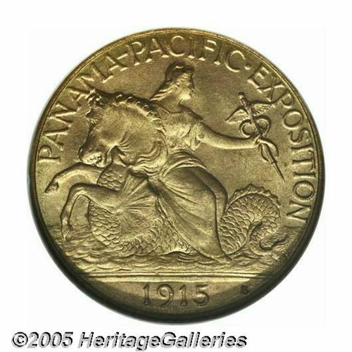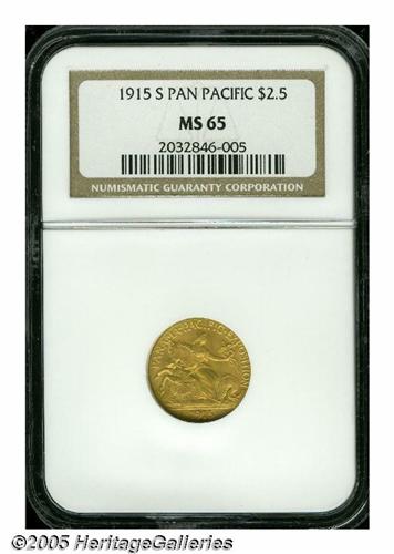 <B>1915-S<$2 1/2> Panama-Pacific Quarter Eagle MS65 NGC.</B></I> This is a splendid Gem quality example with lovely orange-gold luster and exceptional aesthetic appeal. Although we are not aware of any specific die variety studies of these coins, we note that at least two different obverse dies are represented among the Pan-Pac Quarter Eagles in the present sale. On this example the flag of the 5 in the date is horizontally even with the top of the S mintmark. Another example, the NGC MS64 coin, has the top of the 5 horizontally even with the center of the mintmark. While we are not necessarily sure that die variety collecting of these coins will ever catch on, it is a nicety of numismatics to pursue such studies.<BR><I>From the Dr. Kurt Peters Collection.</B></I> From the Dr. Kurt Peters Collection.