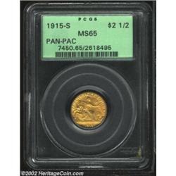 1915-S $2 1/2 Panama-Pacific Quarter Eagle MS65 PCGS. Both sides are tinged in reddish-gold overtones that highlight the smooth, carefully preserved surfaces. Neither the strike nor the luster quality are worthy of criticism. Housed in an older PCGS holder, and worthy of a strong bid. Important notice: We expect to be auctioning lots at the rate of 200-250 per hour. Sometimes eBay Premier live bid software cannot keep up with that pace, so we strongly recommend that you place a realistic proxy bid now as insurance to avoid disappointment. Also please note that all Heritage/CAA lots purchased through eBay Premier carry a 20% Buyer's Premium. Please make sure you read the Terms and Conditions.